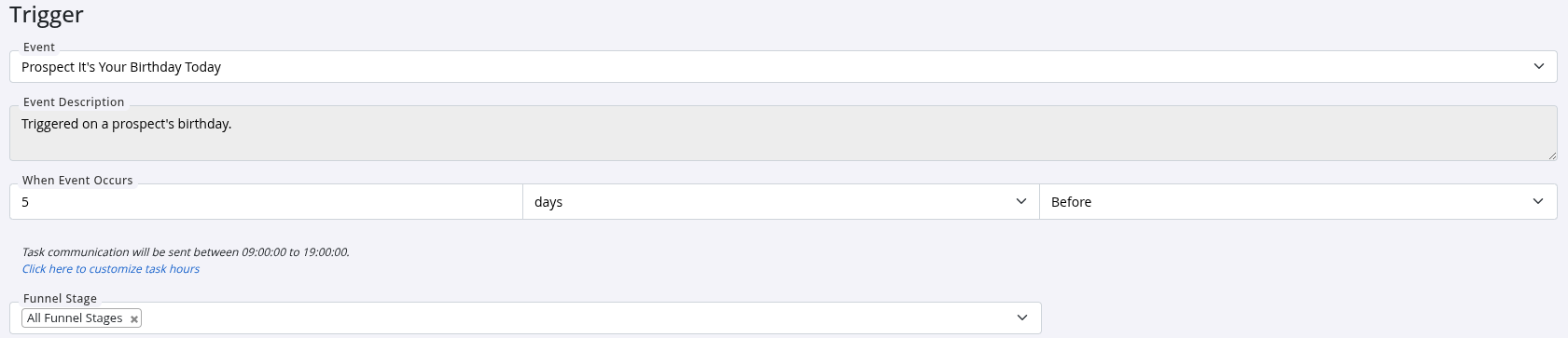 In the example above, the trigger Prospect It’s Your Birthday Today is selected, with the task set to run five days before the prospect’s birthday. A second task could also be created to trigger on the birthday itself, using a different email template.
