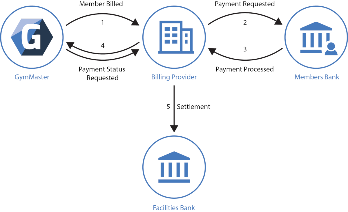First, GymMaster sends the payment request to your billing provider. From there, the request is passed to the member’s bank for processing. The bank then returns a success or failure response back through the same chain — from the bank, to the billing provider, and back into GymMaster — where the member’s account is updated with the result.
