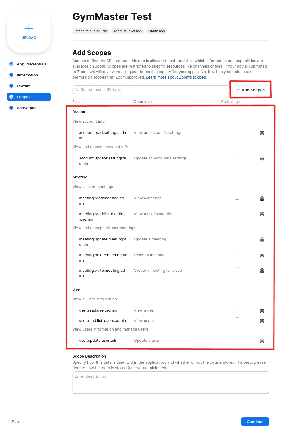 Select Add Scopes and include the following permissions to allow GymMaster to create and manage meetings on your behalf: