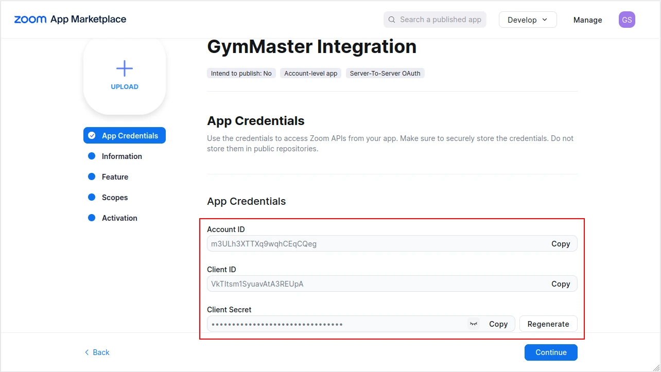 Finally, head to the Activation section and select Activate Your App. Once it’s live, GymMaster can start talking to Zoom.