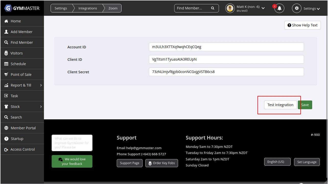 Back in GymMaster, save the page, then click Test Integration. If everything’s connected correctly, you’ll see a green Integration successful message at the top of the screen.