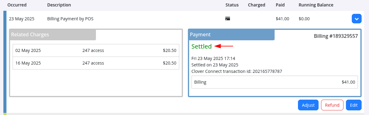 To check this, go to the member’s profile > Accounts and Billing tab, and click once on the line item for the payment. This will expand the transaction and show the status.
